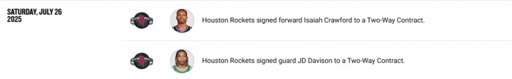 07月27日讯 NBA官网球员流动记录显示,火箭和以赛亚-克劳福德、JD-戴维森签下了双向合同。