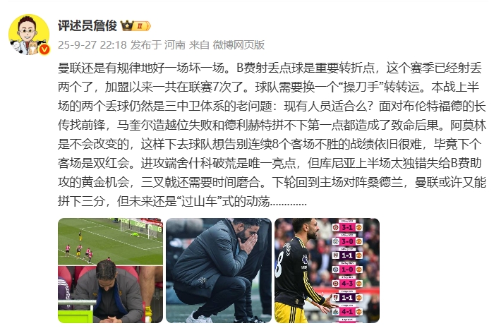 詹俊写道:曼联还是有规律地好一场坏一场。B费射丢点球是重要转折点,这个赛季已经射丢两个了,加盟以来一共在联赛7次了。球队需要换一个“操刀手”转转运。本战上半场的两个丢球仍然是三中卫体系的老问题:现有人员适合么?面对布伦特福德的长传找前锋,马奎尔造越位失败和德利赫特拼不下第一点都造成了致命后果。阿莫林是不会改变的,这样下去球队想告别连续8个客场不胜的战绩依旧很难,毕竟下个客场是双红会。进攻端舍什科破荒是唯一亮点,但库尼亚上半场太独错失给B费助攻的黄金机会,三叉戟还需要时间磨合。下轮回到主场对阵桑德兰,曼联或许又能拼下三分,但未来还是“过山车”式的动荡.............